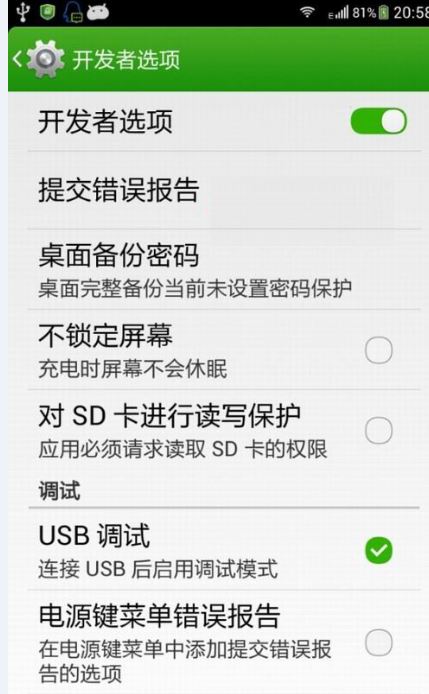 “開發(fā)者選項(xiàng)”菜單中勾選USB調(diào)試