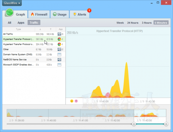 第一步:安裝好并開啟 GlassWire 軟體,可以在「Graph」分頁看到目前電腦的即時(shí)流量高低(網(wǎng)路頻寬使用),預(yù)設(shè)以黃色表示下載流量、粉紅色代表上傳流量。另外,也可點(diǎn)選單一應(yīng)用程式,檢視該應(yīng)用程式的即時(shí)流量畫面。