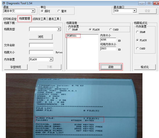 “檔案信息”,選擇“內(nèi)存裝置”為FALSH,點擊“讀取”,可以查詢字體“FONT001”
