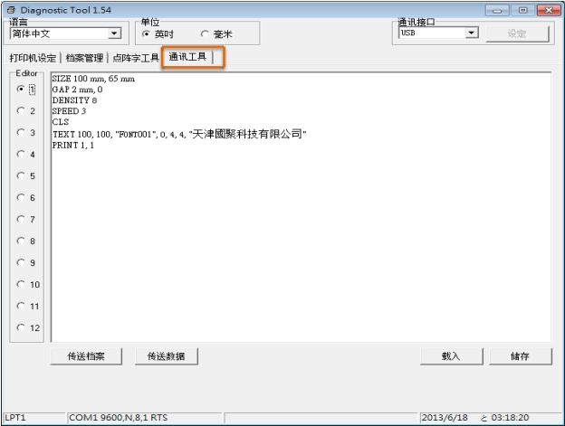 • 點擊“傳送數(shù)據(jù)”,將會將中間空白區(qū)域的編輯區(qū)的TSPL命令傳送至打印機立即執(zhí)行。編輯區(qū)提供12個編輯板塊,便于不同程序命令編輯。
