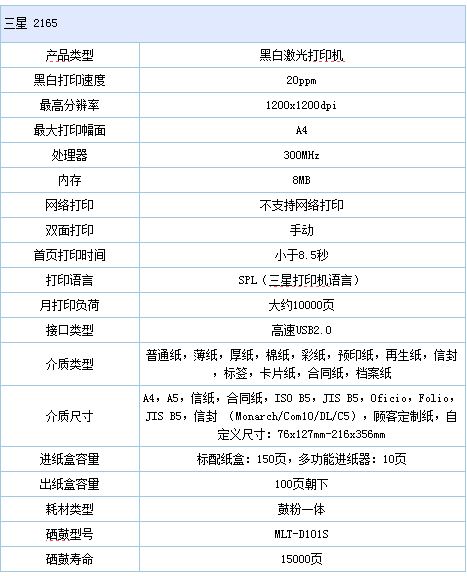 三星2165最大可支持A4打印幅畫,黑白打印速度達(dá)到20ppm,內(nèi)置8MB內(nèi)存、擁有300MHz處理器,支持手動雙面打印,工作效率高,性價比突出。