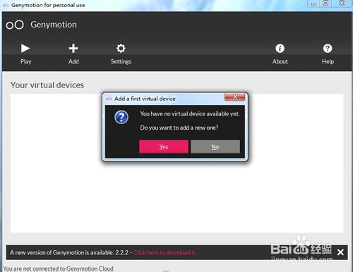 打開Genymotion,第一次進(jìn)入Genymotion,會(huì)檢查你是否有安卓虛擬設(shè)備。如果沒有會(huì)彈出對(duì)話框,詢問你是否現(xiàn)在添加一個(gè)虛擬設(shè)備,點(diǎn)擊yes就可以了