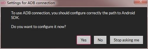 啟動(dòng)過程會(huì)彈出對(duì)話框,詢問是否設(shè)置ADB連接的對(duì)話框,如果需要就點(diǎn)擊是,否則就點(diǎn)擊否。