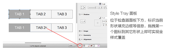 在 Omnigraffle 中,可以通過(guò)拖拽指示器到另一個(gè)組件上的方式將包括邊框填充顏色等樣式復(fù)制過(guò)去,也可以復(fù)制任意單一屬性,大大節(jié)省了重復(fù)或近似組件的樣式修改成本。