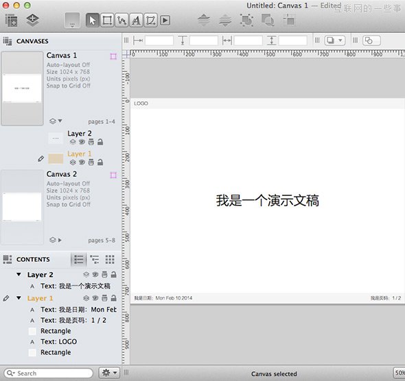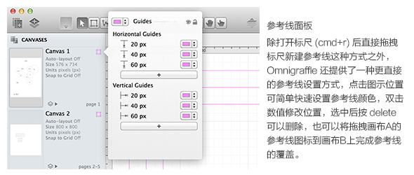 和 fireworks 一樣,Omnigraffle 提供類似的畫布和圖層管理,方便將項(xiàng)目所有內(nèi)容集中在一個(gè)文件中,每個(gè)畫布可以單獨(dú)設(shè)置頁(yè)面背景、大小、單位、網(wǎng)格和參考線,并且可以通過(guò)共享圖層讓所有畫布使用同一個(gè)母版,也就是說(shuō)既可以當(dāng) Indesign 用,也可以當(dāng) PPT 用。