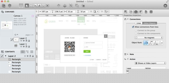 在制作交互模型時(shí),加入對(duì)點(diǎn)擊事件的處理能很方便的演示我們想要的效果,Omnigraffle 支持的腳本不多,沒(méi)有鼠標(biāo)滑過(guò),沒(méi)有動(dòng)畫,只有點(diǎn)擊跳轉(zhuǎn)和點(diǎn)擊顯示或隱藏圖層兩種,對(duì)于一般的原型演示足夠用了,尤其是圖層顯示隱藏,例如可以像圖中所示將浮層中的內(nèi)容放在圖層2上,用關(guān)閉按鈕用來(lái)觸發(fā)隱藏,來(lái)實(shí)現(xiàn)圖示效果。