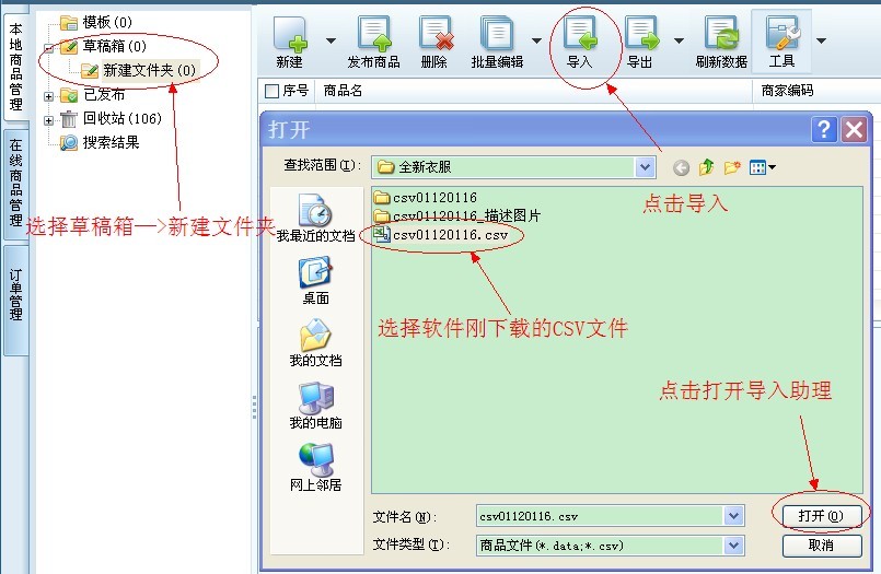 csv01120116.csv——>CSV數(shù)據(jù)文件:這是剛才在“下載商品”時設(shè)置的保存文件地址