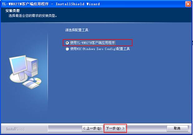 選擇安裝網(wǎng)卡配置工具。如果您希望通過TP-LINK配置工具進(jìn)行配置,請(qǐng)選擇第一項(xiàng),如果您希望通過Windows自帶的配置工具進(jìn)行配置,請(qǐng)選擇第二項(xiàng)。這里選擇第一項(xiàng),點(diǎn)擊下一步繼續(xù)。