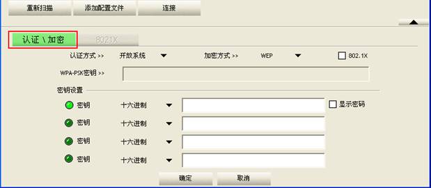 然后,點(diǎn)擊認(rèn)證\加密,填寫認(rèn)證方式和加密信息,對(duì)于認(rèn)證和加密信息,同樣必須保持和接入點(diǎn)的設(shè)置一致,才能保證能連接上接入點(diǎn)以及正常通信。(若接入點(diǎn)沒有設(shè)置無線安全,則不需要配置認(rèn)證\加密,直接點(diǎn)擊確定即可生成配置文件)