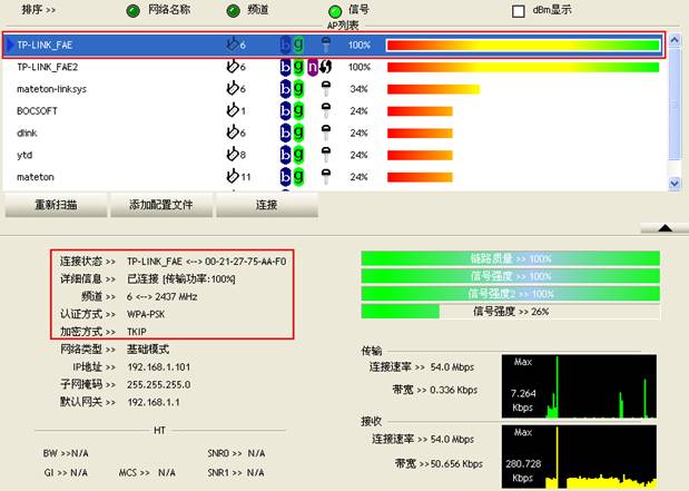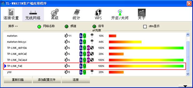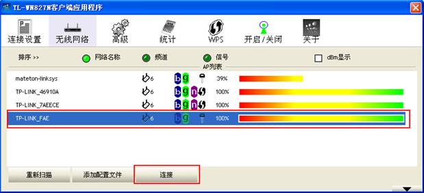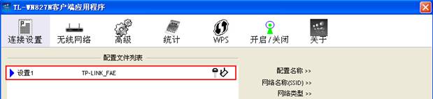 點(diǎn)擊應(yīng)用,網(wǎng)卡就會(huì)自動(dòng)連接到“TP-LINK_FAE”這個(gè)接入點(diǎn)。連接成功后,配置文件前也會(huì)有藍(lán)色的小三角。