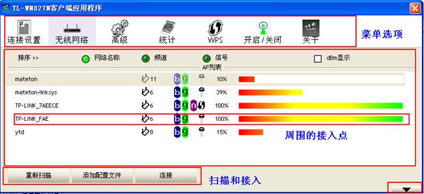 界面上面部分是菜單選項(xiàng),中間部分是掃描到的周圍的接入點(diǎn),下面部分是連接設(shè)置和連接到接入點(diǎn)。雙擊掃描到的接入點(diǎn),可以查看接入點(diǎn)的詳細(xì)信息。
