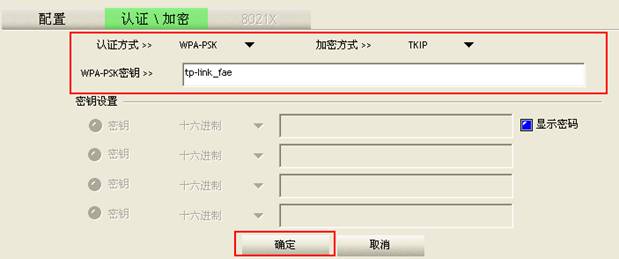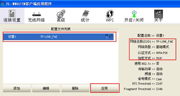 它的認(rèn)證方式是:WPA-PSK;加密方式是:TKIP;密鑰是:tp-link_fae。則TL-WN827N客戶端的認(rèn)證\加密要和接入點(diǎn)一樣設(shè)置,如下圖。