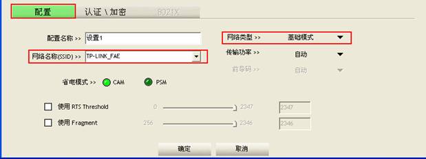 在配置中選擇網(wǎng)絡(luò)類型為基礎(chǔ)模式,網(wǎng)絡(luò)名稱(SSID)填寫接入點(diǎn)的SSID,其它設(shè)置保持默認(rèn)狀態(tài)。