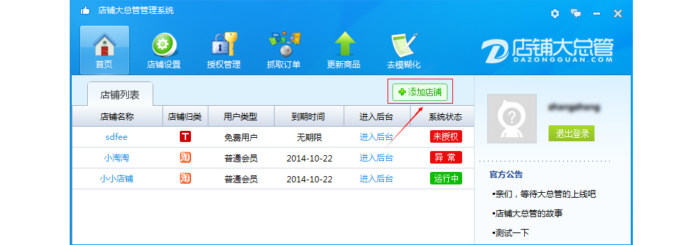 用戶注冊(cè)后,進(jìn)入大總管平臺(tái)即可添加不同的店鋪進(jìn)行訂單利潤(rùn)、商品、庫(kù)存等管理。