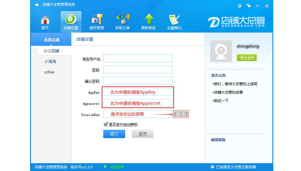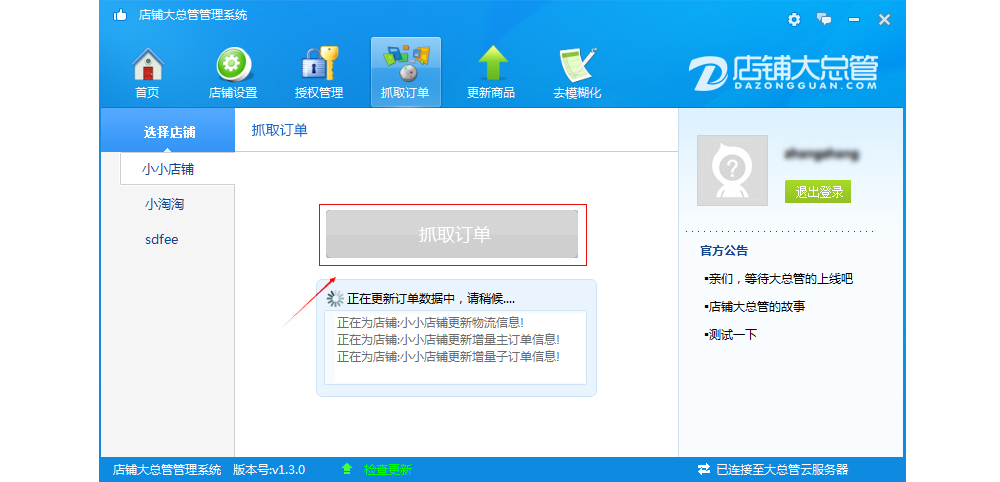用戶通過(guò)下載店鋪大總管客戶端配置后即可自動(dòng)實(shí)時(shí)抓取淘寶、天貓訂單數(shù)據(jù)及商品信息