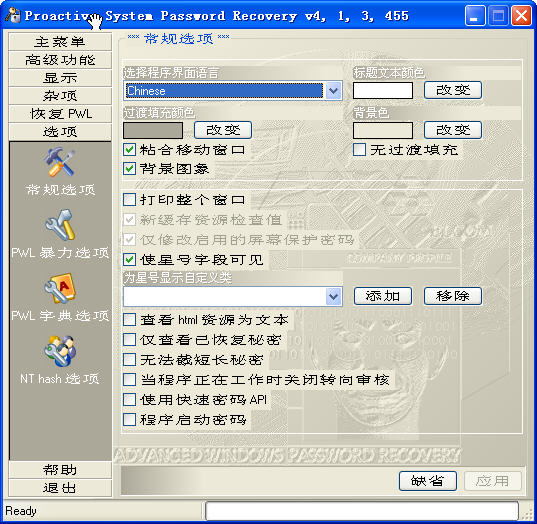 Proactive System Password recovery (簡稱為 PSPR,即以前的 Advanced Windows Password Recovery)是一款功能強大的系統(tǒng)密碼查看工具,可以查看系統(tǒng)登陸密碼,可以恢復Windows所有密碼類型的程序:登錄密碼 (在用戶已登錄和擁有管理員權限時)、屏保護密碼、.NET 護照密碼、RAS 和撥號密碼、共享資源密碼、SYSKEY 啟動密碼、存儲在緩存的憑證密碼、無線 (WEP 和 WPA-PSK) 加密鍵等。