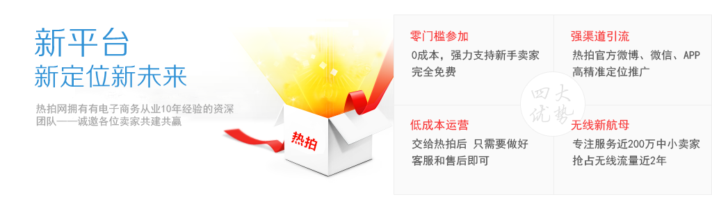 熱拍網(wǎng)是新興的淘寶賣家服務(wù)平臺,致力于滿足淘寶賣家店鋪運營的需要。擁有有電子商務(wù)從業(yè)10年經(jīng)驗的資深團隊,每日精選數(shù)百款超值低價折扣產(chǎn)品推薦