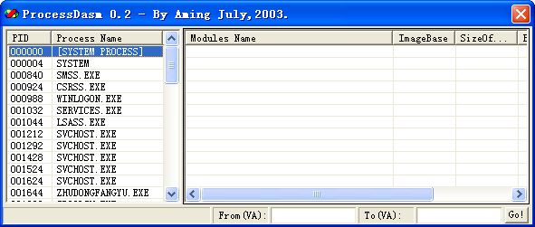 在列表中選左邊的進程欄,當右邊出現(xiàn)模塊欄時,雙擊你要查看的模塊可以得到Pe信息,可以同時查看多個。要反匯編的話,在狀態(tài)欄有卻省的合法地址,你可以定制你的地址,然后按“GO!”就進行反匯編了。也可以同時反匯編多個文件。