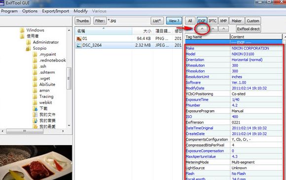 開啟軟體后,選擇要編輯的照片,如果原先就有Exif資訊,會(huì)在右邊顯示所有的Exif,現(xiàn)在的數(shù)位相機(jī)所拍攝的沒意外都會(huì)有,如果想要編輯Exif,在右上角EXIF按鈕下方點(diǎn)擊「︿」。