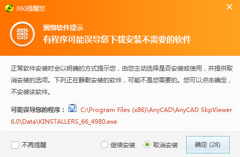 軟件會安裝推廣軟件,不喜勿下!安裝時(shí)候若遇到360等安全軟件提示攔截,選擇取消安裝即可。如圖
