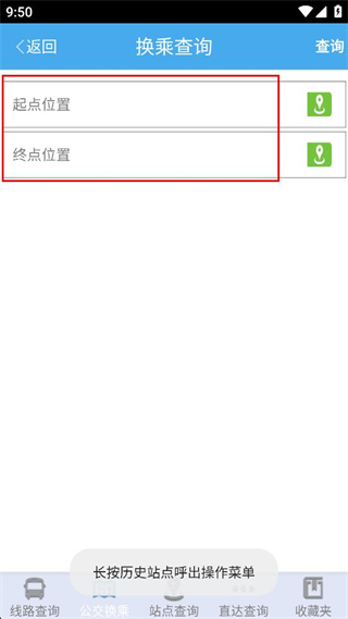 4、在換乘查詢頁(yè)面,依次填寫(xiě)起點(diǎn)位置和終點(diǎn)位置,準(zhǔn)備進(jìn)行公交換乘查詢。