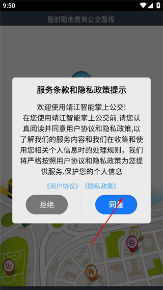 1、打開(kāi)靖江公交應(yīng)用,出現(xiàn)服務(wù)條款和隱私政策提示,點(diǎn)擊同意按鈕,進(jìn)入應(yīng)用主界面。