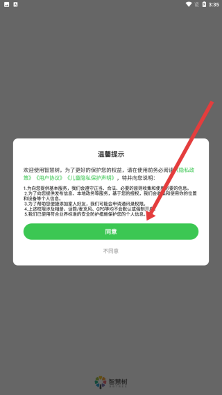 1、打開(kāi)智慧樹(shù)APP,在彈出的溫馨提示彈窗內(nèi),點(diǎn)擊綠色同意按鈕,確認(rèn)相關(guān)協(xié)議與聲明,進(jìn)入登錄注冊(cè)環(huán)節(jié)。