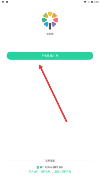 2、進(jìn)入家長(zhǎng)版登錄界面后,點(diǎn)擊綠色手機(jī)登錄/注冊(cè)按鈕,跳轉(zhuǎn)至手機(jī)號(hào)輸入頁(yè)面,推進(jìn)賬號(hào)開(kāi)通流程。