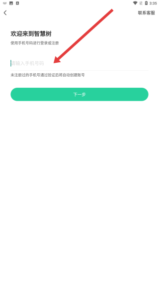 3、在手機(jī)號(hào)輸入頁(yè)面,填寫(xiě)手機(jī)號(hào)碼,點(diǎn)擊下一步按鈕,未注冊(cè)號(hào)碼驗(yàn)證后將自動(dòng)創(chuàng)建智慧樹(shù)賬號(hào),完成注冊(cè)操作。