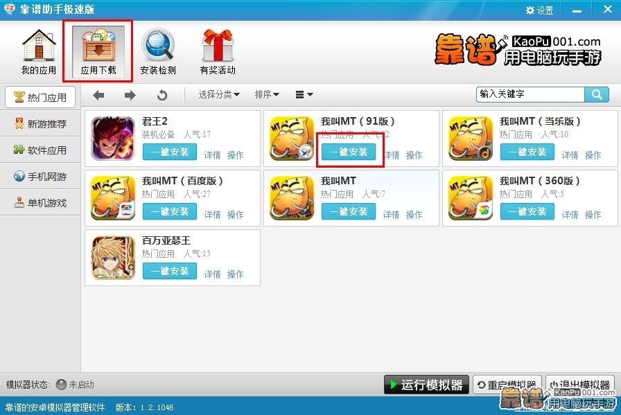 點擊應(yīng)用下載,然后選擇你要下載的游戲,點擊“一鍵安裝”即可裝到我的應(yīng)用里,由于MT游戲較大,安裝的時候時間會比較久,一會會詳細(xì)說到。