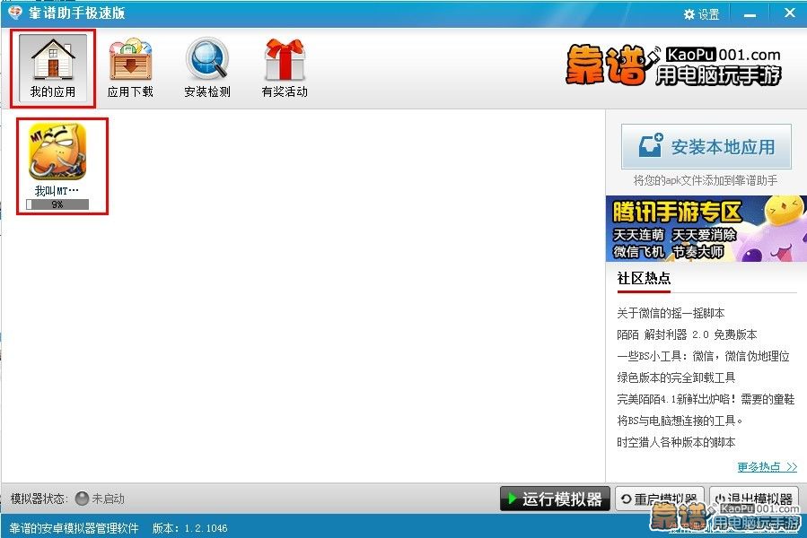 安裝到我的應(yīng)用之后,靠譜模擬器就會啟動,這時還未完全安裝好游戲,需要再次點擊我叫mt游戲圖標(biāo),讓游戲安裝到模擬器內(nèi)。即可成功啟動游戲。