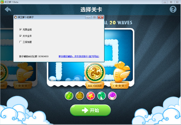 蘿卜保衛(wèi)戰(zhàn)猴子輔助是專用于保衛(wèi)蘿卜PC版的輔助工具,具備無(wú)限金錢、關(guān)卡全開(kāi)、三倍加速三大功能,隨著版本的更新,將會(huì)提供更多功能,敬請(qǐng)期待。保衛(wèi)蘿卜官方PC桌面版發(fā)布了,這是真正的保衛(wèi)蘿卜電腦版,并不需要通過(guò)安卓模擬器了,直接下載安裝后就可以在桌面上運(yùn)行了,與此同時(shí),保衛(wèi)蘿卜電腦版輔助工具也第一時(shí)間推出了。
