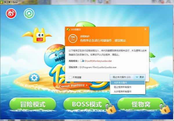第二點(diǎn):安裝了殺毒軟件的朋友們請(qǐng)關(guān)閉殺軟或者加載一下白名單,方可正常使用保衛(wèi)蘿卜猴子輔助??!