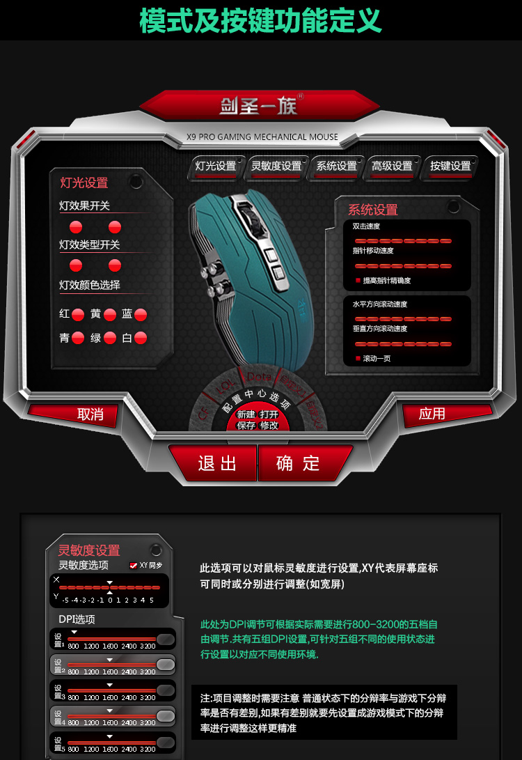 劍圣一族X9專業(yè)游戲鼠標(biāo)驅(qū)動(dòng)程序,官方最新驅(qū)動(dòng)程序,不僅能驅(qū)動(dòng)X9鼠標(biāo),還能讓用戶對(duì)x9鼠標(biāo)的燈光、靈敏度、按鍵功能、鼠標(biāo)宏等進(jìn)行自定義設(shè)置,讓其更符合自己的使用習(xí)慣,玩兒游戲更得心應(yīng)手。