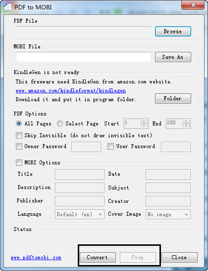 PDF to MOBI是一款免費(fèi)的電子書和文檔相互轉(zhuǎn)換工具,可將PDF文件轉(zhuǎn)換為MOBI電子書格式。pdf是工作中常見的一款文檔格式,國際通用。MOBI格式是亞馬遜kindle閱讀設(shè)備的專屬格式。沒有復(fù)雜的設(shè)置和選項(xiàng),只需點(diǎn)擊幾次鼠標(biāo)即可完成轉(zhuǎn)換。PDF to MOBI需要KindleGen支持,可從亞馬遜官網(wǎng)下載
