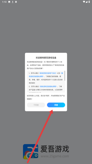 1、打開愛吾游戲寶盒,彈出用戶協(xié)議與隱私政策彈窗,點擊藍色同意按鈕,接受條款后進入應用主界面,開啟游戲瀏覽。