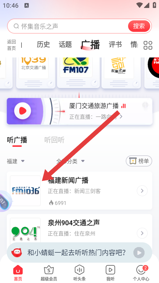 2、在廣播的頁面中,選擇想要收聽的電臺(tái),例如福建新聞廣播,點(diǎn)擊進(jìn)入該電臺(tái)的播放界面。