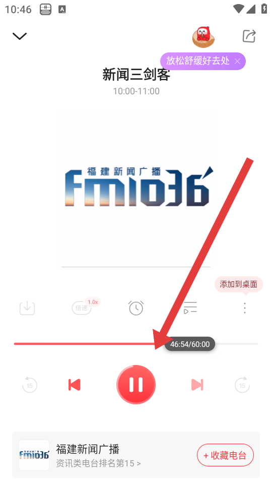 3、進(jìn)入電臺(tái)播放界面后,點(diǎn)擊播放控制區(qū)域的按鈕,即可收聽廣播,還可進(jìn)行暫停、調(diào)整播放進(jìn)度等操作。