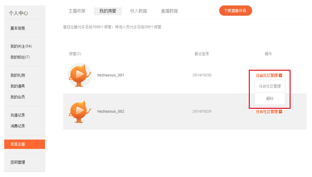 主播在“我是主播/我的房管”頁面中,可以將直播間房管任命為社區(qū)管理員,也可以將社區(qū)管理員撤銷。