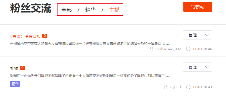 針對主播個人頁的帖子主播和社區(qū)管理員具有如下權限(鼠標懸浮于帖子右邊【管理】按鈕即可浮出):