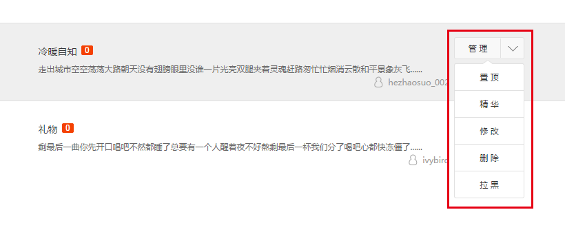 主播和社區(qū)管理員對主播個人頁的帖子具有相同的管理權限,包括:置頂,精華,修改,刪除,拉黑。