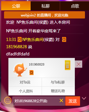 聊天分為公聊和私聊兩種,其中私聊是限制富豪等級在3富以上的用戶才能使用。
