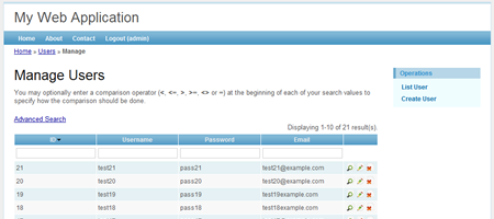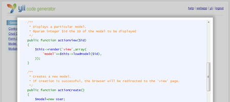 使用上述代碼生成器,您可以進(jìn)一步產(chǎn)生代碼,對(duì)選定的數(shù)據(jù)表實(shí)現(xiàn)了典型的CRUD(創(chuàng)建,讀取,更新,刪除)的特征。生成的代碼是高度可用的和可定制的,證實(shí)了well-adopted MVC設(shè)計(jì)模式(model-view-controller)。 再次,Yii做了所有的創(chuàng)建工作而不需要你寫(xiě)一行代碼。