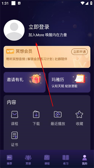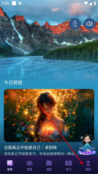 1、打開(kāi)墨爾冥想APP,點(diǎn)擊底部我的,進(jìn)入個(gè)人頁(yè)面。