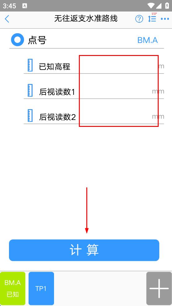 4、在支水準路線相關頁面,首先在對應的輸入框中輸入已知高程、后視讀數(shù)1、后視讀數(shù)2等數(shù)據(jù),然后點擊計算按鈕,即可進行無往返支水準路線的計算。