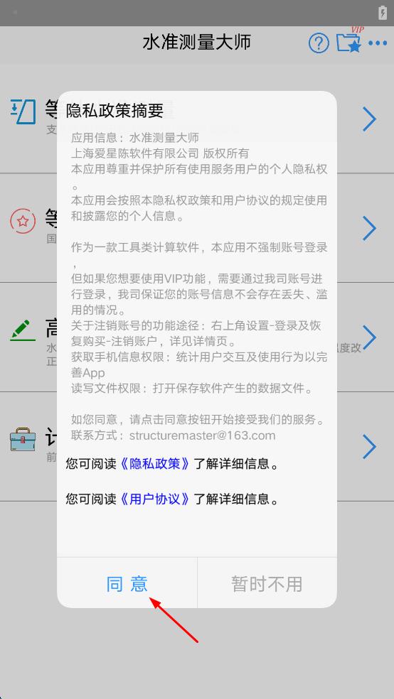 1、打開水準測量大師APP,會彈出隱私政策摘要頁面,仔細閱讀相關內(nèi)容后,點擊同意按鈕,進入到APP主界面。
