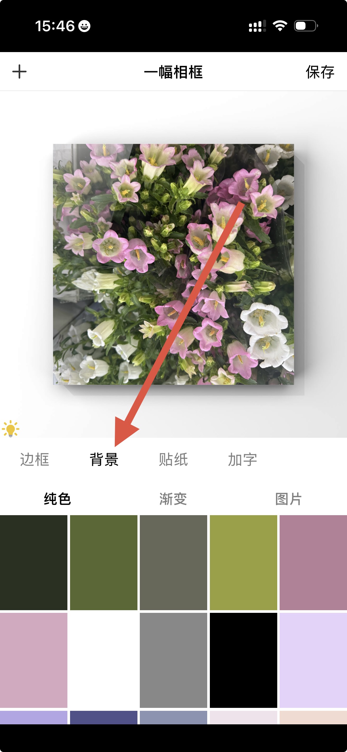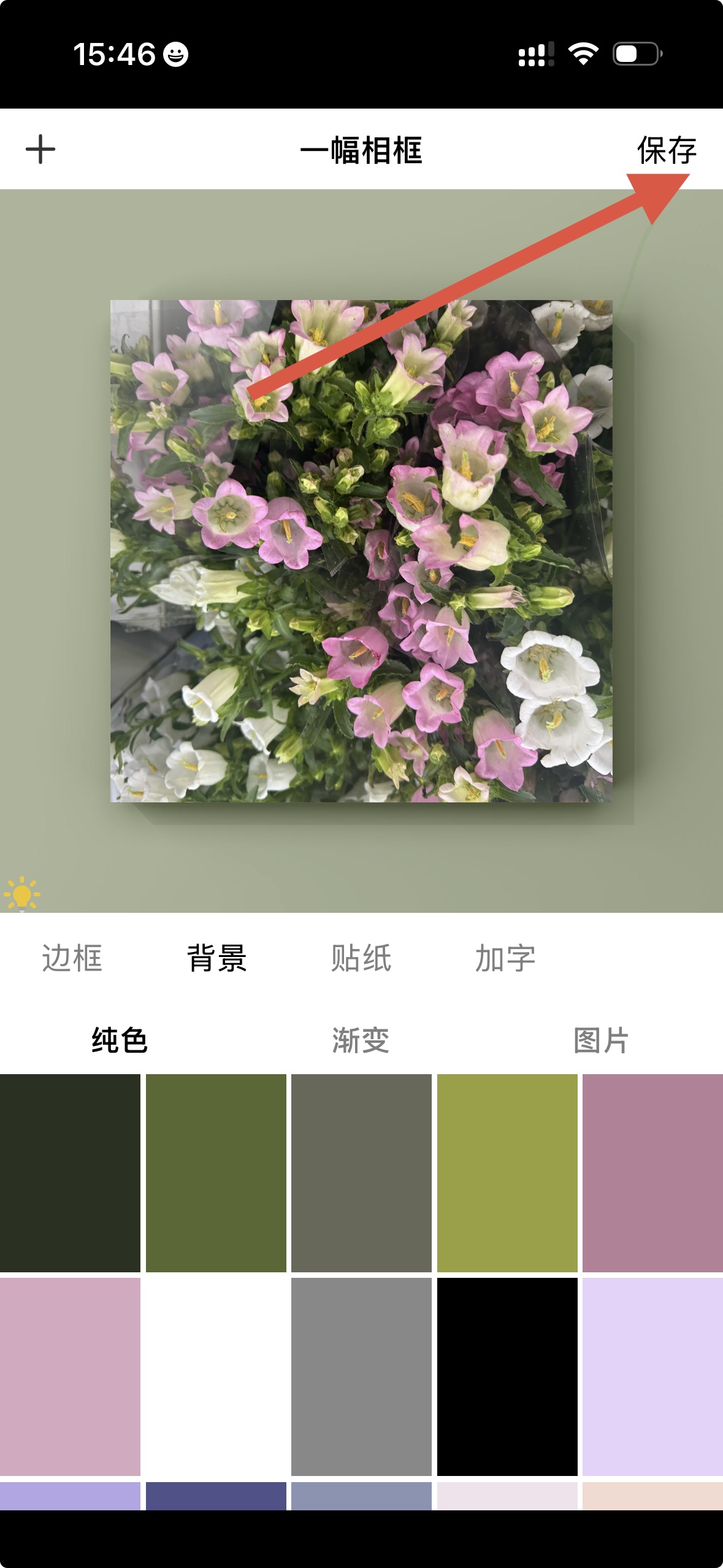 3.手指從屏幕底部邊緣向上滑動(dòng)可以選擇邊框的不同形式,點(diǎn)擊邊框位置可以調(diào)整背景的色彩。滿意后點(diǎn)擊屏幕右上角三個(gè)圓點(diǎn),就可以對(duì)制作好的效果進(jìn)行保存和分享了。