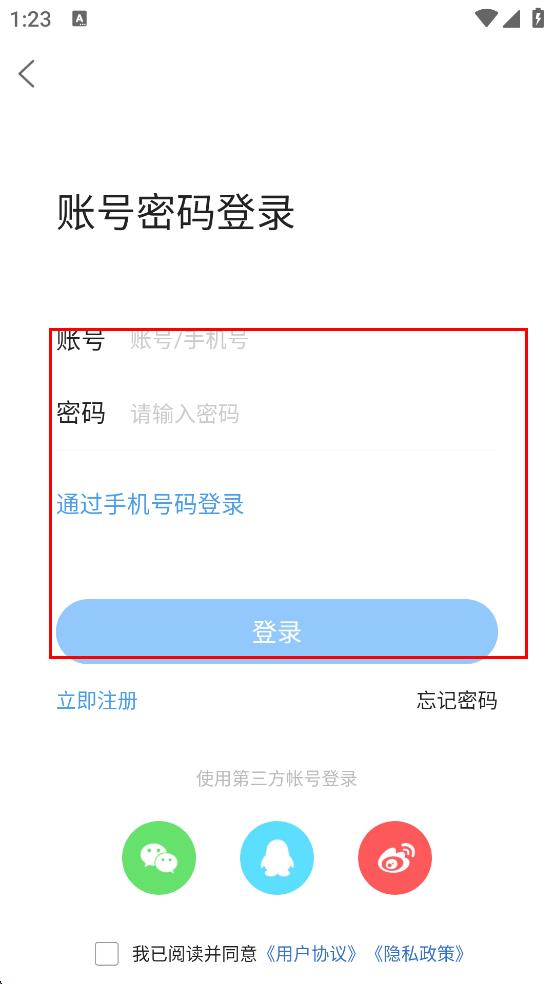 4、在賬號密碼登錄界面輸入賬號和密碼,勾選已閱讀并同意相關協(xié)議后點擊登錄,完成登錄操作。