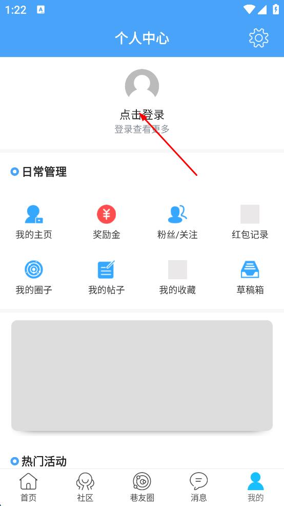 3、在個人中心頁面上方看到“點擊登錄”提示,點擊“點擊登錄”,進入賬號密碼登錄界面。