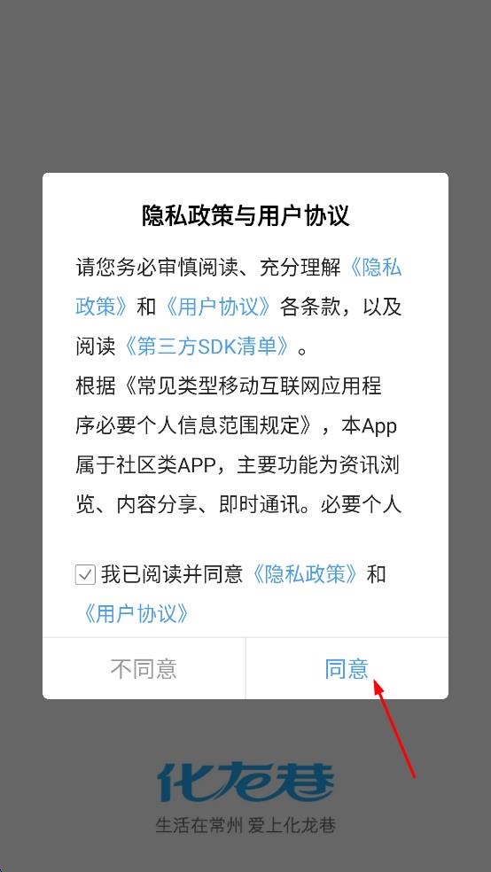 1、打開化龍巷,彈出隱私政策與用戶協(xié)議提示,點擊同意,進入軟件首頁。